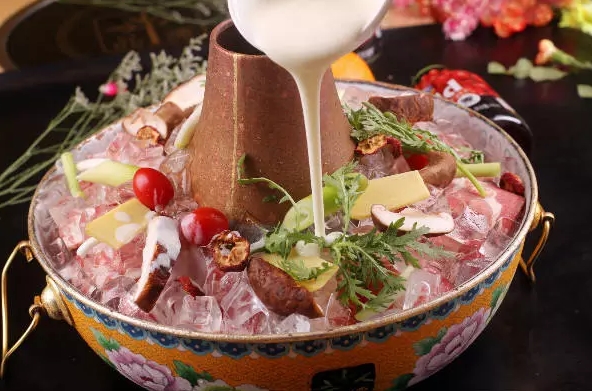 2.把提前準(zhǔn)備好的冰塊拿出來,鋪在加過水的鍋底,冰面上再鋪上切好的羊肉塊。